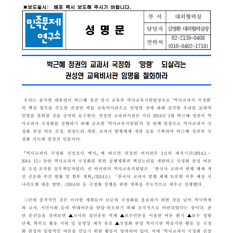 박근혜 정권의 교과서 국정화 ‘망령’ 되살리는 /권성연/ 교육비서관 임명을 철회하라